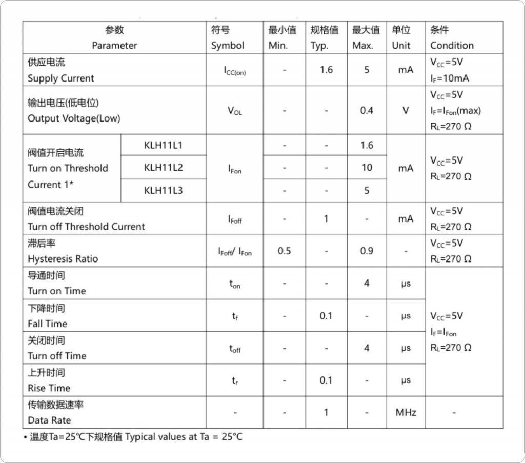 KLH11LX系列由一个砷化镓红外发光二极管和一个高速集成电路检测器组成,该输出检测器包含了一个施密特触发器,利用其回滞特性,便于脉冲整形,提高抗噪性能。
