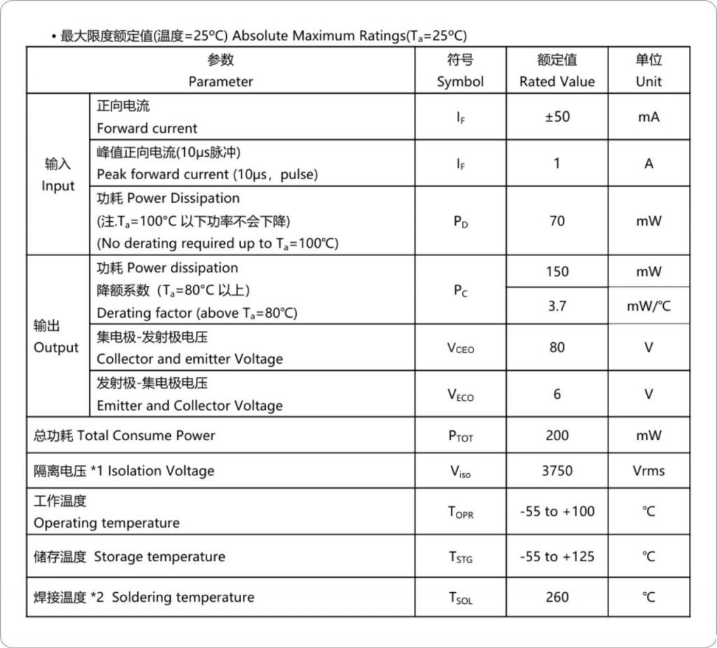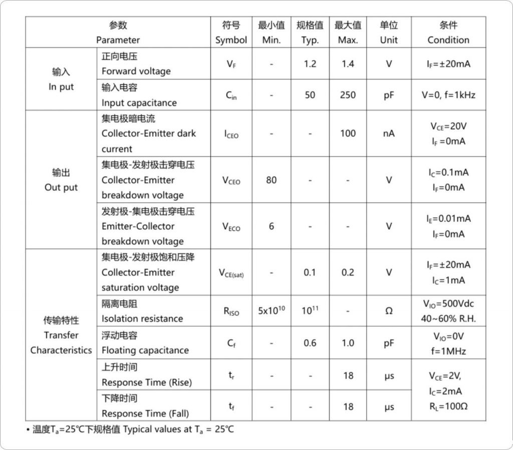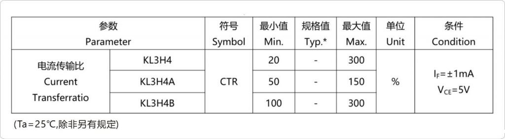 ◆电流转换比(CTR)范围:≥20%(IF=±1mA, VCE=5V, Ta=25℃)