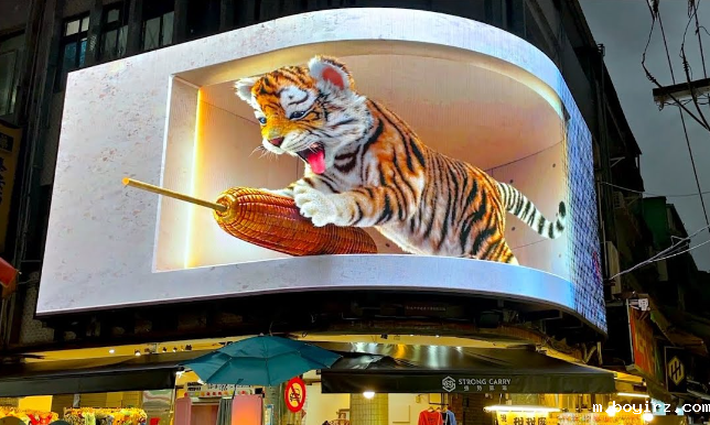 在裸眼3D屏幕上展示一只跳跃的草原狮子,创造了独特的户外广告体验。