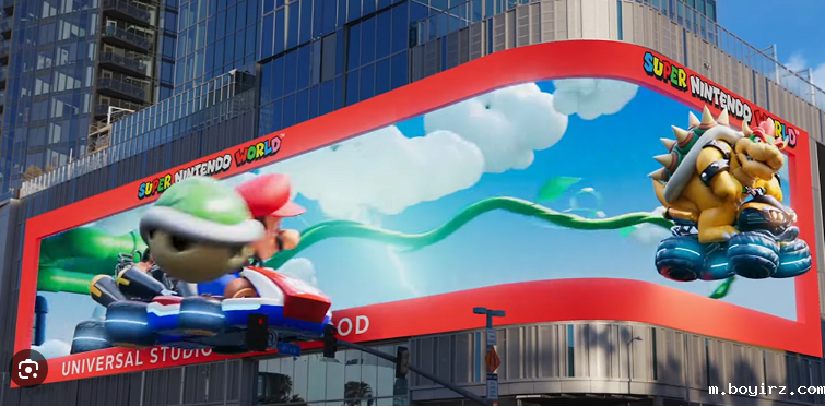 在 3D LED广告牌上描绘马里奥和主题公园游客与库巴一起进行激动人心的比赛。